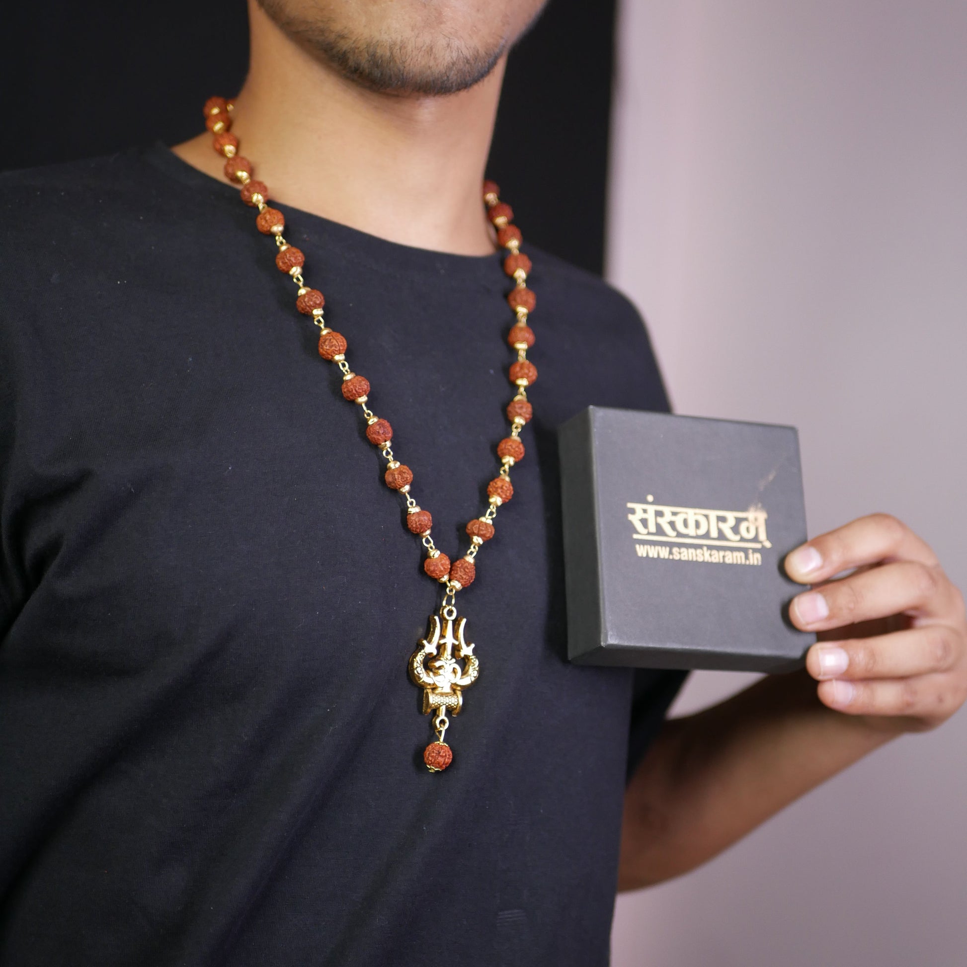 π Gold Plated Om Trishul Damru Pendant with Rudraksha Necklace (100% off)